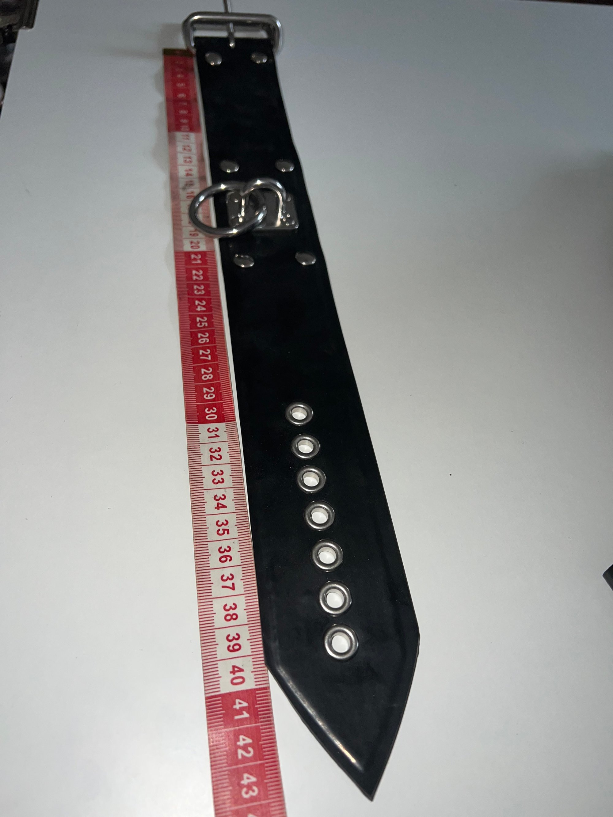 Pair of double layered 1.05mm thick reinforced latex with 100% stainless steel hardware details and buckle and eyelet closure.