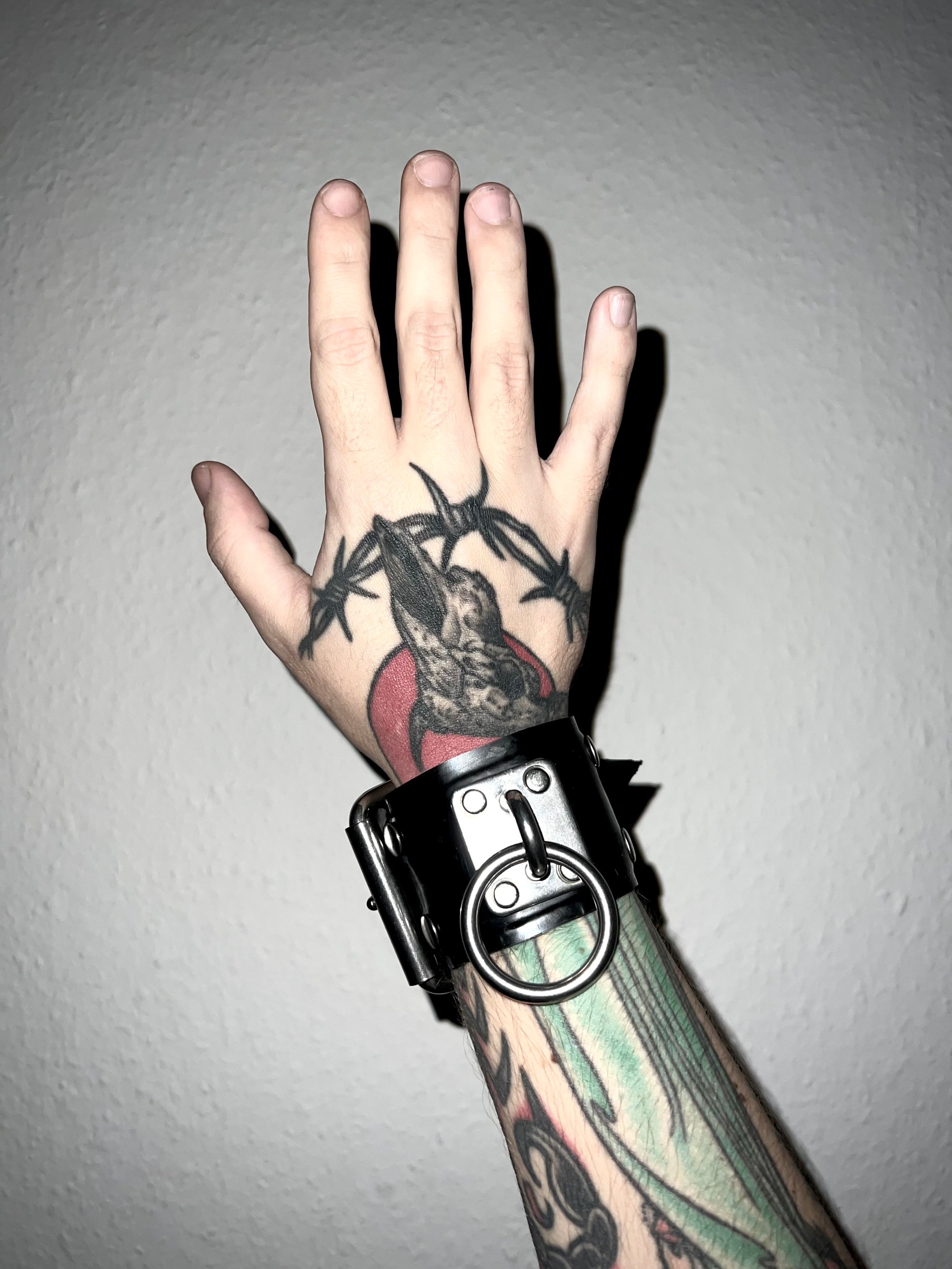 Pair of double layered 1.05mm thick reinforced latex with 100% stainless steel hardware details and buckle and eyelet closure.