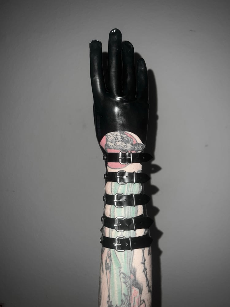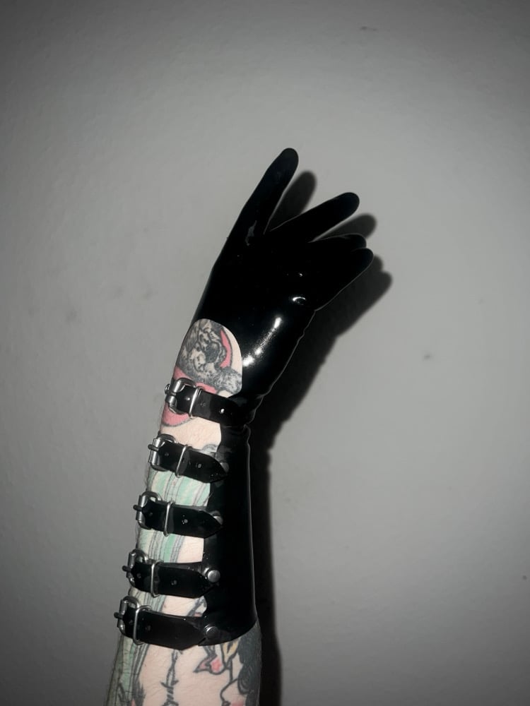 .4 mm molded latex gloves with stainless steel buckles and rivets.